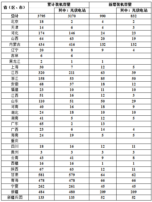 截至2015年9月底,全国光伏发电装机容量达到3795万千瓦,其中,光伏电站3170万千瓦,分布式光伏625万千瓦。1-9月全国新增光伏发电装机容量990万千瓦,其中,新增光伏电站装机容量832万千瓦,新增分布式光伏装机容量158万千瓦。1-9月全国累计光伏发电量306亿千瓦时,弃光电量约30亿千瓦时,弃光率为10%;弃光主要发生在甘肃和新疆地区,其中,甘肃省弃光电量17.6亿千瓦时,弃光率28%,新疆(含兵团)弃光电量10.4亿千瓦时,弃光率20%。