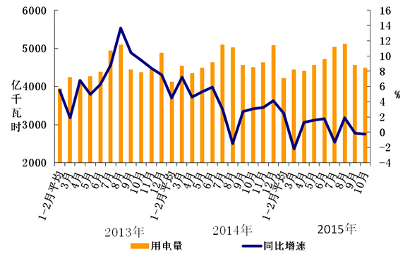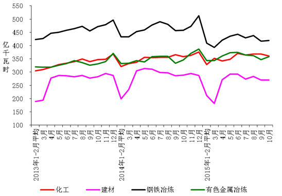 1-10月份,化学原料制品、非金属矿物制品、黑色金属冶炼、有色金属冶炼四大高载能行业用电量合计13877亿千瓦时,同比下降 2.3%,增速同比回落6.4个百分点;合计用电量占全社会用电量的比重为30.3%,对全社会用电量增长的贡献率为-99.7%。其中,化工行业用电量3534亿千瓦时,同比增长2.2%,增速同比回落2.9个百分点;建材行业用电量2563亿千瓦时,同比下降6.5%,增速同比回落13.4个百分点;黑色金属冶炼行业用电量4224亿千瓦时,同比下降7.8%;增速同比回落9.5个百分点;有色金属冶炼行业3556亿千瓦时,同比增长3.8%,增速同比回落0.5个百分点。