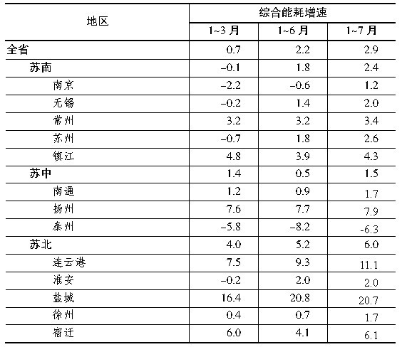 苏北地区能耗依然偏高。1~7月,苏南、苏中规模以上综合能耗同比分别增加2.4%和1.5%,低于全省平均水平0.5%和1.4%;苏北地区同比增长6.0%,高于全省平均水平3.1%。十三个省辖市中,连云港、盐城增幅最快,同比分别增长20.7%和11.1%;泰州同比下降6.3%,能耗下降最快。与上半年相比,除盐城(同比回落0.1%)、淮安(持平)外,其余各市能耗增幅比上半年均有回升。如表1所示。