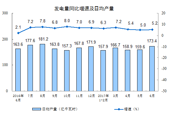 17日,国家统计局发布2017年1-6月份规模以上工业发电量29598亿千瓦时,同比增长6.3%。其中新能源方面,太阳能发电量289亿千瓦时,同比增长最快,达35.1%;风力发电量1327亿千瓦时,同比增长17.9%。
