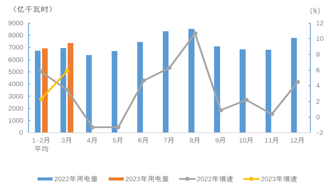 图1 2022、2023年分月全社会用电量及其增速