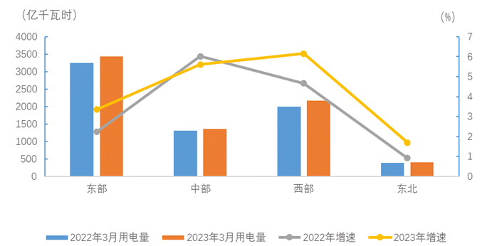 3月份,东、中、西部和东北地区全社会用电量增速分别为5.7%、4.3%、7.4%和5.4%。