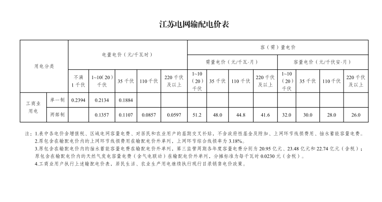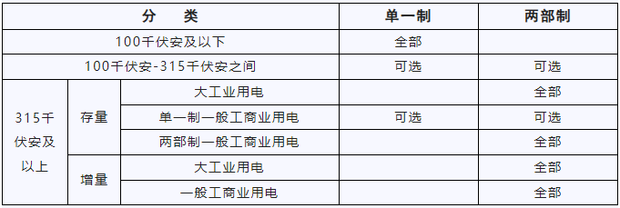工商业类别归并后,根据用户用电容量,分别执行单一制电价、两部制电价,具体如下: