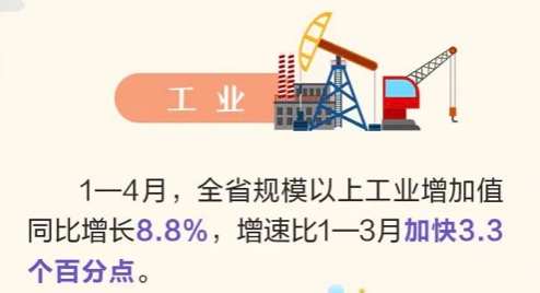 江苏省统计局4月经济运行数据显示,今年1-4月全省规模以上工业增加值同比增长8.8%,增速比1-3月加快3.3个百分点。