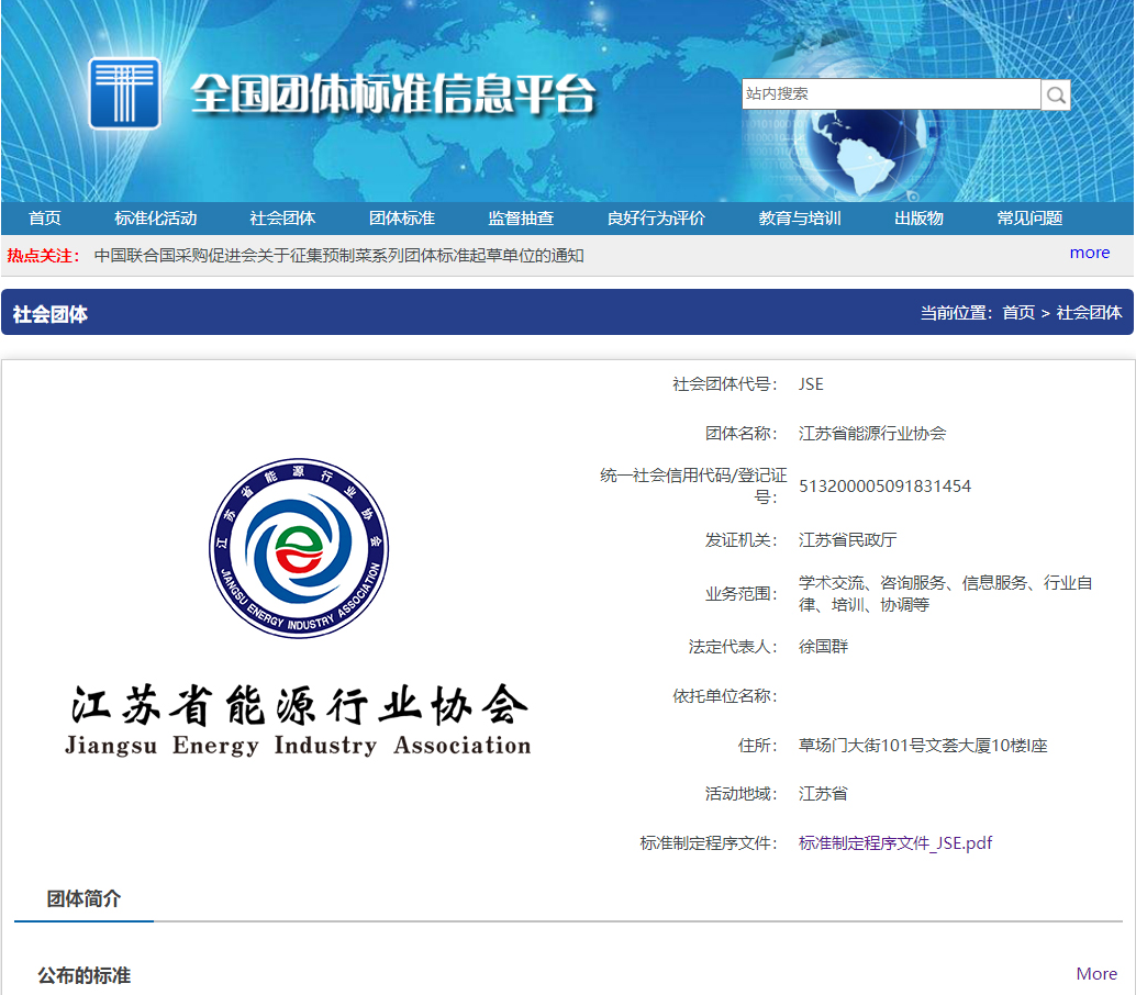 7月28日,省能源行业协会收到全国团体标准信息平台的通知,正式成为团体标准信息平台团体用户及国家标准化管理委员会注册的团体标准制定单位,协会的团体标准代号为协会英文简称“JSE”。