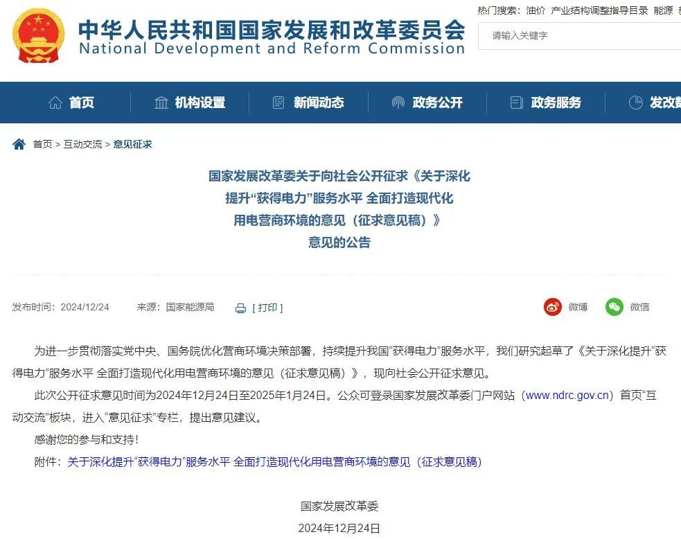12月24日,国家发展改革委发布《关于深化提升“获得电力”服务水平全面打造现代化用电营商环境的意见(征求意见稿)》。