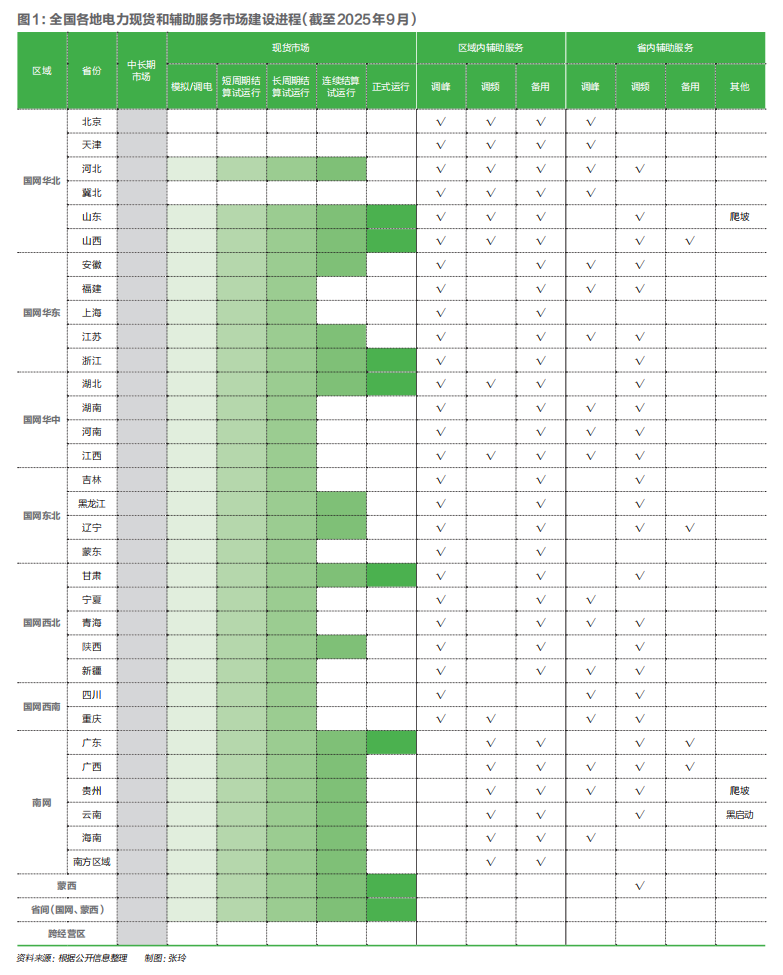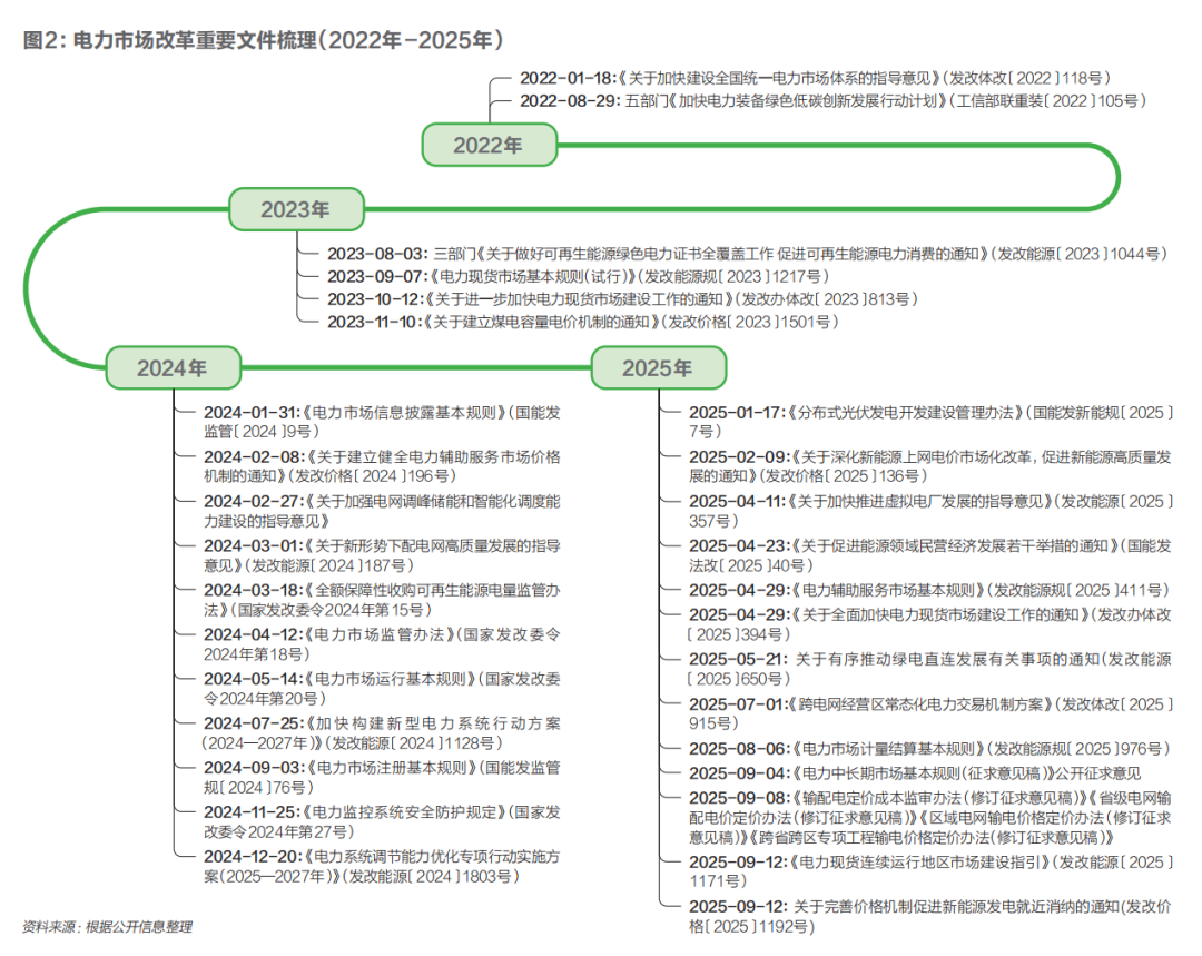 自2015年中发〔2015〕9号文发布以来,中国电力体制改革进入新阶段。十年来,改革在“市场化、低碳化、一体化”三个维度推进,电力行业运行机制、价格体系和治理方式发生了系统性转变。第一,批发侧市场体系初步形成、零售侧竞争格局初现。十年来,中国逐步建立了以电能量市场为主体、以辅助服务市场和容量补偿机制为支撑的批发侧市场体系。电能量市场初步形成了“以现货市场发现价格、中长期市场稳定预期”的双层格局。辅助服务市场实现从“免费提供、事后补偿”向“市场化竞价”转变,调峰、调频、备用等服务品种持续完善。容量补偿机制在部分省份试点运行,通过容量补偿或容量电价保障系统可靠性。同时,零售侧竞争格局逐步显现。到2024年,全国售电公司超过4400家,民营主体占比接近60%。售电公司逐步从单一购售电向综合能源服务转型,业务范围涵盖绿电交易、碳资产管理、电能管理和需求响应等。各省普遍推行分时电价机制,建立“尖峰—高峰—平段—低谷—深谷”五时段电价体系,峰谷价差进一步扩大,价格信号更有效传导至用户侧。第二,以省为主体探索市场化改革路径,市场规则体系不断完善。本轮电力市场化改革呈现“省为主体、试点先行、逐步推进、统筹统一”的特点。中央负责顶层设计,地方结合资源结构、产业基础和负荷特征开展试点,各省市场建设呈现共性与差异并存的格局(见图1)。部分省份率先启动现货市场连续试运行,形成较为成熟的交易体系;部分地区则以中长期交易为主,配合局部现货试点推进。差异化的市场设计反映出各地在电源结构、水电季节性、负荷特征等方面的不同。2022年以来,国家能源局陆续出台市场准入、计量结算、信息披露三项基础性规则,以及中长期、现货、辅助服务三类交易规则,明确全国统一电力市场的总体目标(见图2)。第三,市场化交易电量持续扩大,价格机制逐步确立。2021年-2024年,全国市场化交易电量从3.78万亿千瓦时增至6.18万亿千瓦时,占全社会用电量的比重由45.5%提升至62.7%。交易主体数量从4.7万家增至8.1万家,市场参与范围和竞争格局显著扩大。随着燃煤和新能源机组陆续入市,市场化价格机制逐步确立,电力资源配置方式由计划分配向市场出清转变。能涨能跌的价格信号初步形成,市场化定价在资源配置中的作用显著增强。“双碳”目标提出后,低碳化成为电力改革的重要方向。新能源机组全面参与市场交易,新能源装机和发电量占比持续上升。2025年,风光装机预计达16.9亿千瓦,占总装机的45.9%;2024年风光发电量约1.83万亿千瓦时,占全国发电量的19.4%,利用率保持在95%以上。新能源市场化交易电量占新能源发电量的一半以上,新能源市场化消纳水平显著提高(见图3)。配套政策持续完善。中央先后出台136号文、1192号文和1501号文,推动风电、光伏机组全面入市,明确上网电价市场化形成机制,建立容量电价制度,保障传统机组合理收益的同时,为新型电力系统提供容量支撑。绿证和绿电交易快速发展,2024年绿电交易规模达4460亿千瓦时,占新能源发电量约25%,实现环境价值的市场化。输配电价改革适应低碳转型要求,三轮监管周期基本完成。改革建立“准许成本+合理收益”机制,成本核算更细化,功能定位更清晰。2025年起,电价体系进一步向低碳化、一体化方向调整:探索新能源就近消纳的单一容量制电价,对清洁能源外送工程实行两部制电价,并将环境税、水资源税纳入定价成本,引导电网投资向特高压通道和智能化配网倾斜。一体化是电力市场改革的重要目标。十年来,跨省跨区交易规模持续扩大,市场协同能力显著增强。2024年,跨省跨区中长期交易电量达1.39万亿千瓦时,同比增长19.8%;省间现货交易量达376亿千瓦时。南方区域实现“五省一区同步出清”,北方区域构建“统一市场、两级运作”体系。2025年,跨经营区电力现货交易首次常态化开展,全国统一电力市场框架初步形成。输配电侧监管体系进一步向一体化适配。国家统一省级、区域、跨区电网资产核算标准,实行跨区工程与省、区域电网同步成本监审,完善跨区通道结算机制,明确线损偏差损益归属并推行最优路径定价。零售侧的绿电交易、碳交易、储能调节等新型市场主体跨区域参与度提高,市场资源流动性增强。随着区域市场协同机制的建立,中国电力市场正在由分散试点走向统一体系。省际壁垒逐步减少,资源配置范围持续扩大,为实现全国统一电力市场目标奠定了基础。