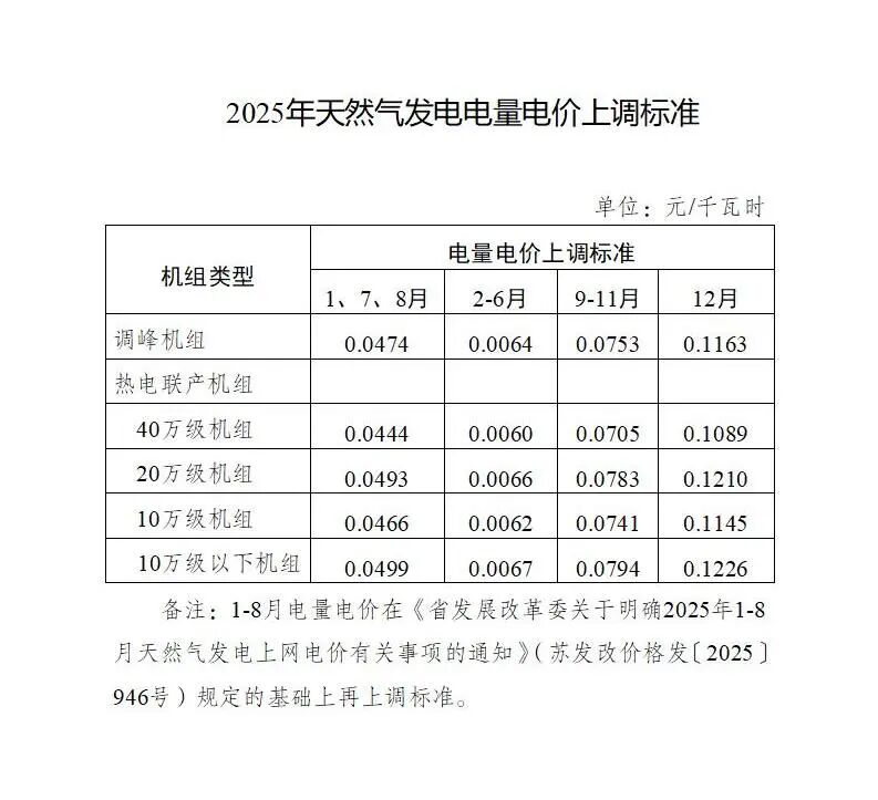 为保持天然气发电平稳运行,保障电力供应安全稳定,根据《省发展改革委关于优化完善天然气发电上网电价管理有关事项的通知》(苏发改价格发〔2024〕1432号)规定,现将2025年天然气发电上网电价有关事项通知如下: