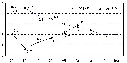 全省能耗增幅超过去年同期水平。7月份,全省工业用电和综合能耗增幅均延续了逐月回升的态势,能耗增幅今年来首次超过去年同期水平,但总体仍保持较低水平,两项指标增速均低于全国平均水平。1~7月,全省规模以上工业累计综合能耗13149.8万吨标准煤,同比增长2.9%,较上半年回升了0.7%,高于去年同期涨幅0.2%,如图1所示。