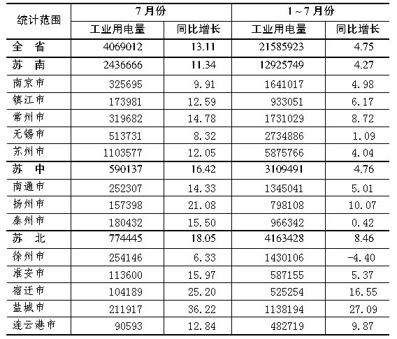 表4:1~7月份周边省市用电量情况 单位:亿千瓦时,%