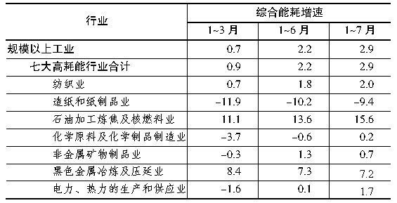 高耗能行业能耗增幅“五低两高”。1~7月,七大高耗能行业综合能耗10970.9万吨标准煤,同比增长2.9%,与规模以上工业能耗增幅持平,较上月回升0.7%,高于去年同期0.8%。其中,纺织业、造纸和纸品业、化学原料和化学制品制造业、非金属矿物制品业和电力、热力生产和供应业等五大行业综合能耗增幅低于全省平均水平,石油加工炼焦及核燃料业、黑色金属冶炼和压延业能耗分别高出平均水平12.7%和4.3%,具体情况如表2所示。