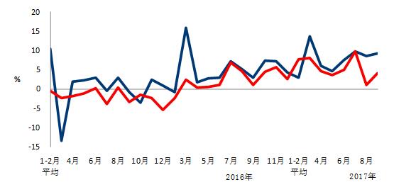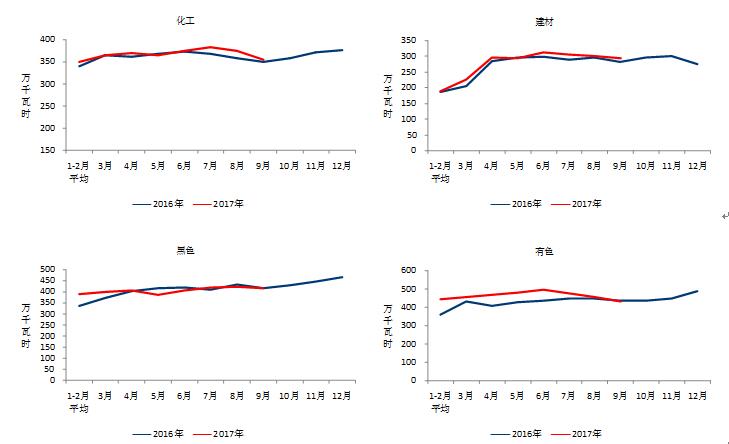 9月份,四大高载能行业用电量合计1491亿千瓦时,同比增长0.9%,增速比上年同期提高0.3个百分点,占全社会用电量的比重为28.1%。其中,化工行业用电量355亿千瓦时,同比增长3.5%,增速比上年同期提高8.4个百分点;建材行业用电量292亿千瓦时,同比增长4.1%,增速与上年基本持平;黑色金属行业用电量415亿千瓦时,同比下降0.4%,增速比上年同期提高0.2个百分点;有色金属冶炼行业429亿千瓦时,同比下降2.0%,增速比上年同期回落6.3个百分点。
