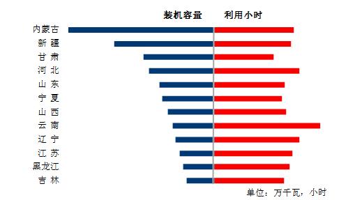 图6 1-9月份风电装机较多省份风电装机容量和设备利用小时