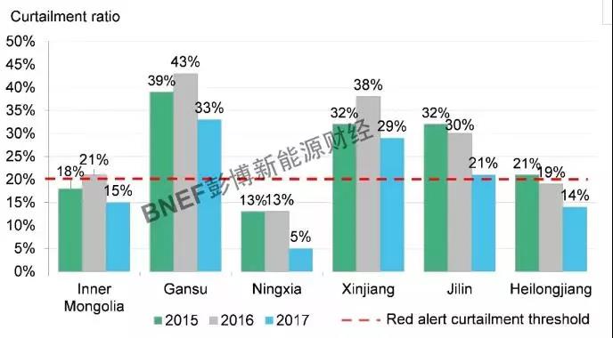 此预警结果与彭博新能源财经于2月5日发布的《China’s Wind Market to Rebound in 2018》报告中的预测一致。报告认为由于此三省份弃风限电已得到明显改善且已低于20%限电警戒线,这些省份很大可能将解除红色预警。另外,吉林2017年弃风限电率已降至21%,也可能在近期解除红色预警。