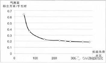 (4)机组的经济性,旁路全关时的负荷工况点。根据燃机机组的燃烧特性,负荷越低,燃烧效率越低,经济性越差。尽管机组容量越大,机组效率越高,但当燃气机组进行深度调峰时,其效率将明显降低,成本也将大幅提高,下图1为9F(S109FA)机组气耗特性曲线。
