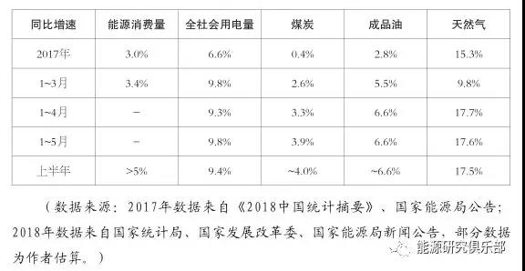 上半年国民经济延续稳中向好的发展态势,转型升级稳步推进,质量效益不断提升,经济增长的韧性、稳定性和可持续性不断增强。受宏观经济持续向好、“冷冬+早夏”天气、环保督查等因素综合影响,2018年上半年能源消费延续了2017年的快速增长态势,电力、煤炭、天然气、成品油等主要能源品种均实现较快增长,二季度呈现“淡季不淡”特征。初步估算,上半年全国能源消费同比增长超过5%(表 1),明显高于2017年全年增速。