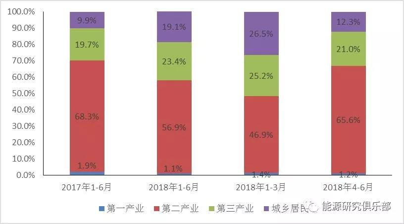 二产用电对全社会用电量增长的贡献率明显下降,但二季度反弹。上半年,三大产业用电量和城乡居民生活用电量的同比增速分别达到10.3%、7.6%、14.7%、13.2%,对全社会用电量增长的贡献率分别为1.1%、56.9%、23.4%、19.1%。相比去年,二产用电量贡献率下降约12个百分点,而第三产业和城乡居民生活对全社会用电量增长的拉动作用增强,反映出电力需求的驱动力正在从二产拉动向三产和居民协同拉动转变,与我国经济结构优化的方向一致。但是,应该注意到,与一季度相比,二季度二产用电量的贡献率由降转升,特别是制造业日均用电量扭转了3月的下降趋势,5、6月分别达到96.6亿千瓦时/天和99.7亿千瓦时/天,连续两个月创历史新高,反映出制造业生产明显加快。
