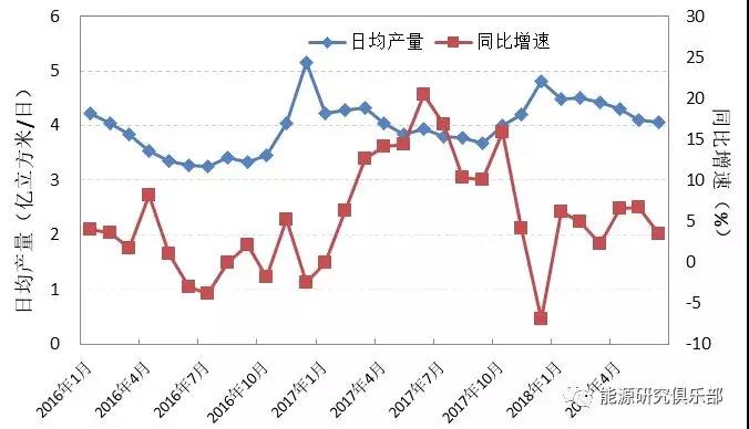 今年上半年,我国天然气产量775亿立方米,同比增长4.6%。逐月来看,采暖季过后,国内产量随需求逐渐下降,日均产量由1月的4.5亿立方米/日下降至6月的4.1亿立方米/日。