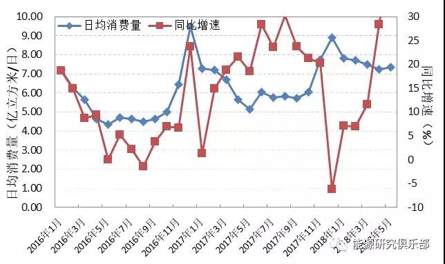 之间,天然气化工同比略有下降。逐月来看,供暖季结束后用气需求开始逐月下降。日均表观消费量由去年12月的8.9亿立方米/日,逐步回落至4月的7.2亿立方米/日,5月需求略有增长至7.4亿立方米/日。尽管相比一季度,二季度日均消费量有所下降,但消费量同比增速超过20%,远高于一季度增速,天然气消费“淡季不淡”特征明显。