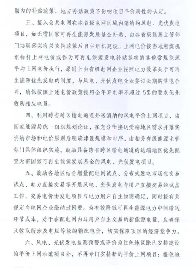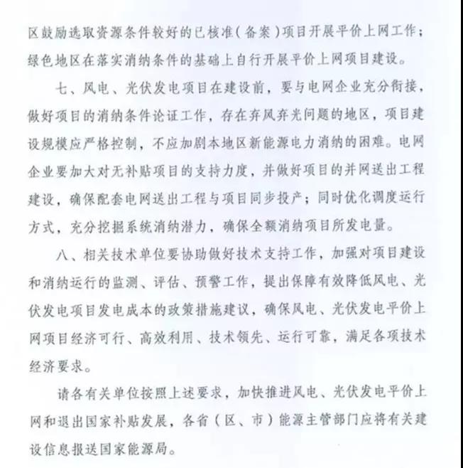 《通知》表示,各地区要认真总结本地区风电、光伏发电开发建设经验,结合资源、消纳和新技术应用等条件,组织开展平价上网和无补贴风电、光伏发电项目建设。
