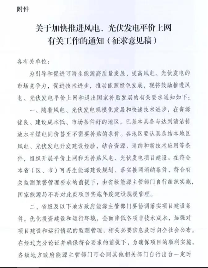 9月13日,国家能源局下发了《关于加快推进风电、光伏发电平价上网有关工作的通知(征求意见稿)》(以下简称“通知”)。
