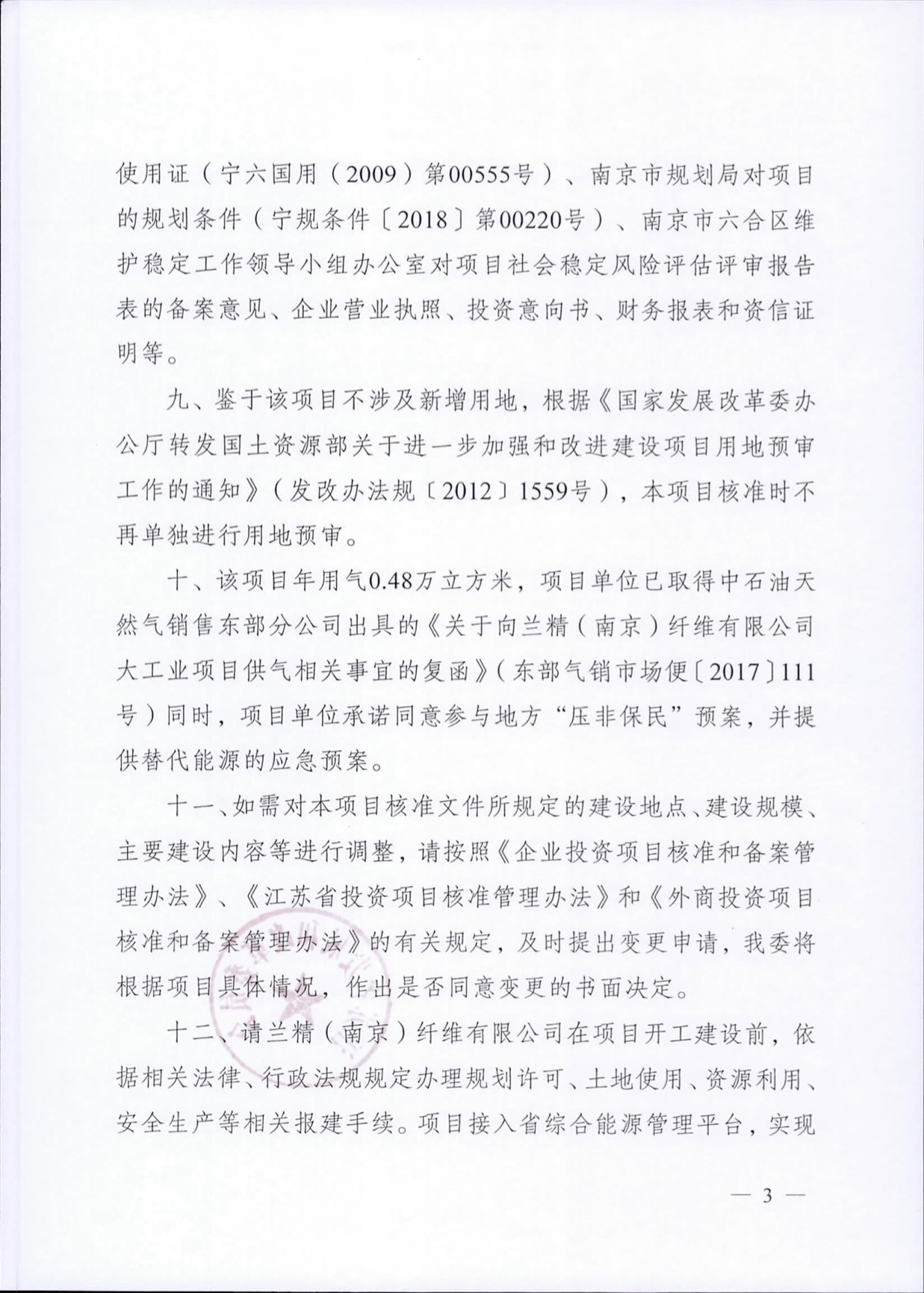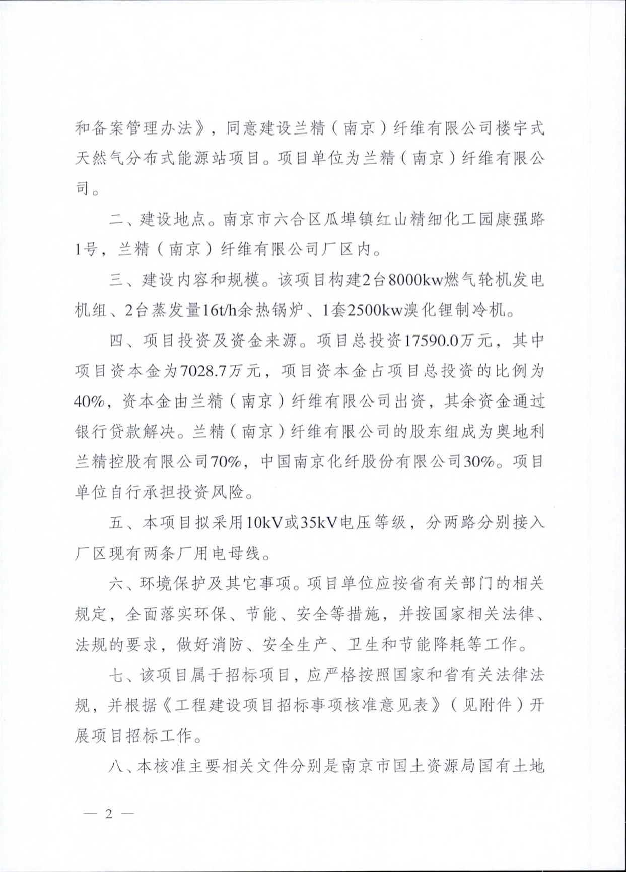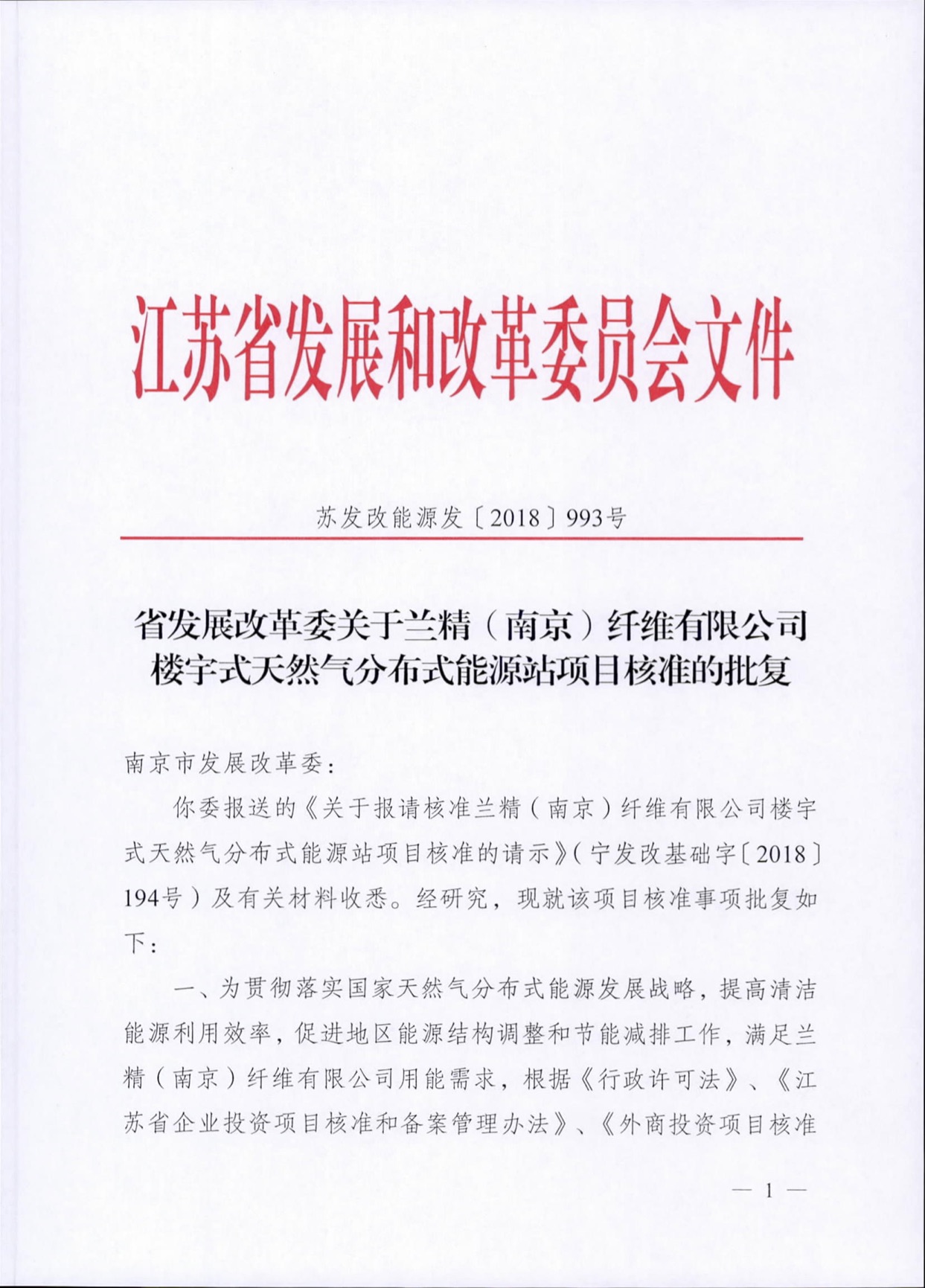 江苏省发改委关于兰精(南京)纤维楼宇式天然气分布式能源批复