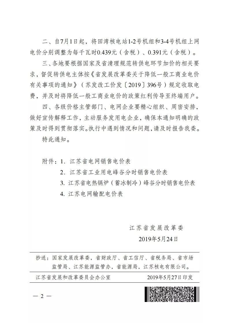 除了一般工商业的降价情况,本次江苏还对田湾核电站机组进行了电价调整,1-2号机组调整为0.439元/千瓦时(含税),3-4号机组调整为0.391元/千瓦时(含税)。