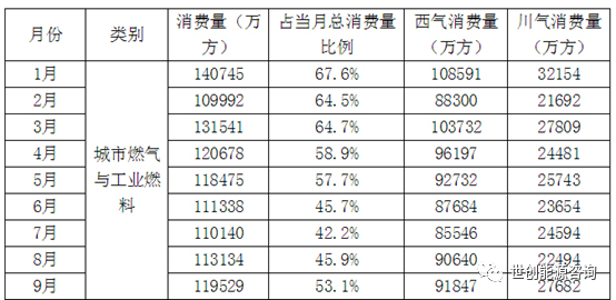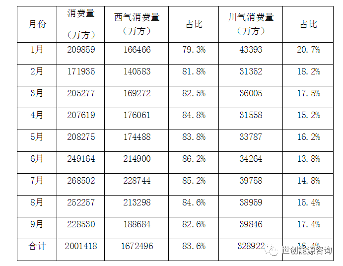 2019年前三季度江苏省管道天然气供应量200.14亿方,同比增加8.04亿方,增长4.2%;其中西气供应量167.25亿方,占比83.6%;川气32.89亿方,占比16.4%。详细各月情况见表1。