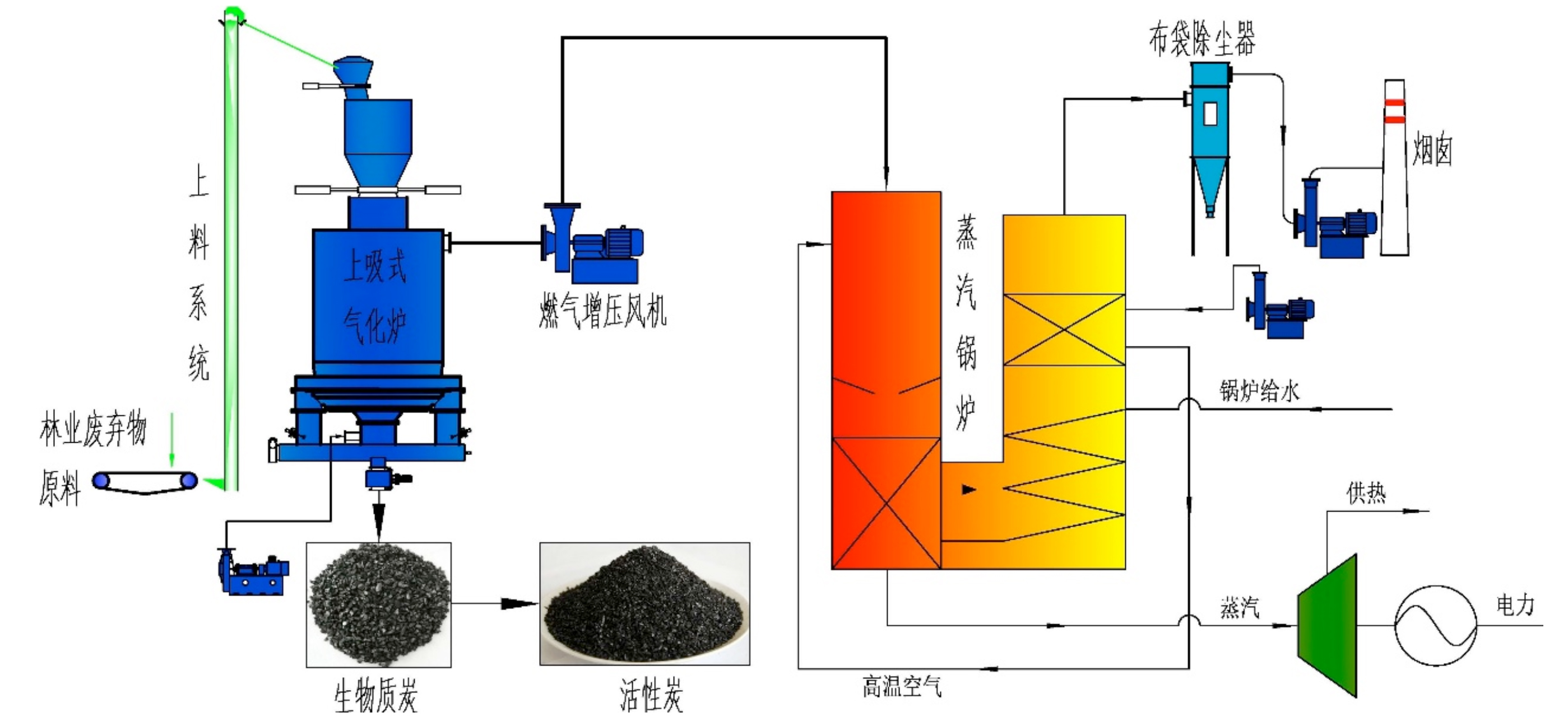 生物质废弃物气化热、电、活性炭联产系统工艺简图