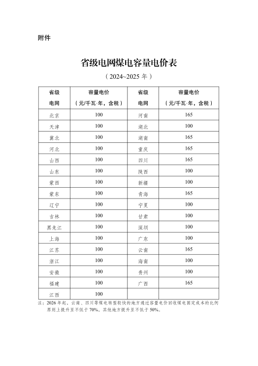 二是明确容量电价水平。煤电容量电价按照回收煤电机组一定比例固定成本的方式确定。综合考虑各地电力系统需要、煤电功能转型情况等因素,2024~2025年,多数地方通过容量电价回收固定成本的比例为30%左右即每年每千瓦100元,部分煤电功能转型较快的地方适当高一些;2026年起,各地通过容量电价回收固定成本的比例提升至不低于50%,即每年每千瓦165元。