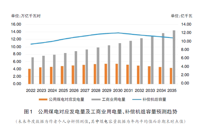 预计2024年煤电装机约11.83亿千瓦(年平均值),符合规定范围的煤电容量约占煤电总容量的85%,为10.05亿千瓦,年利用小时数按4600小时计算,年发电量为4.62万亿千瓦时。按照到2030年碳达峰前煤电容量2%~5%的增长率增长、2030年后煤电容量和发电量负增长、年利用小时数由2024年的4600小时逐步降至2035年的4000小时测算,2024年到2035年历年的补偿容量及对应的发电量预测情况见图1。