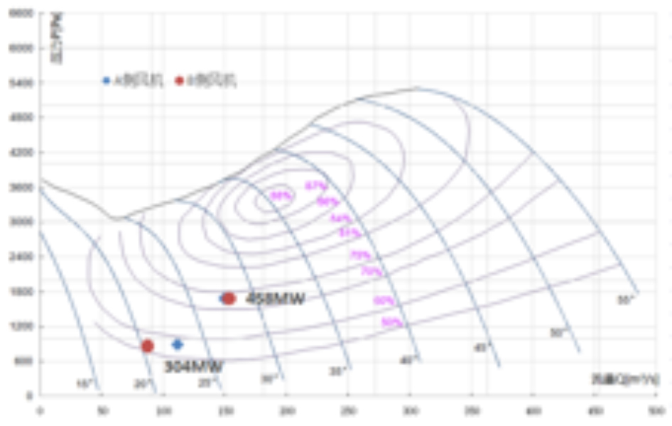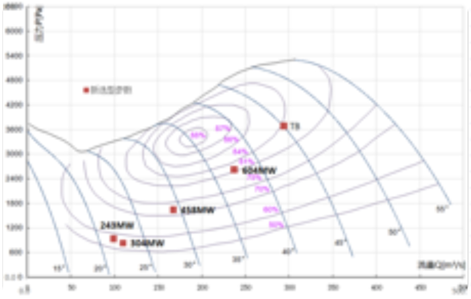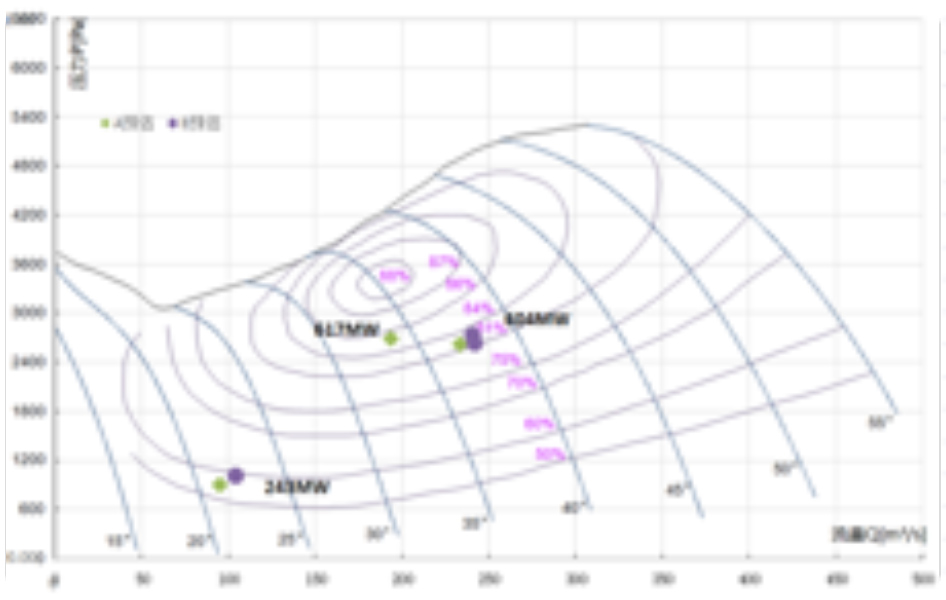 1.高负荷设计效率最高为86%,预估实际效率70%左右,风机实际与设计效率偏差较大;