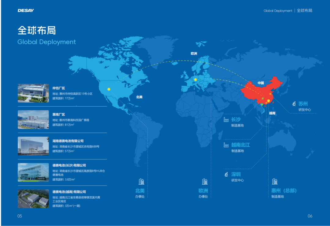 德赛电池作为一家知名的“老牌”企业,已经为全球优质客户提供锂电池整体解决方案超20年,从业以来一直在持续深化其代工能力、研发实力,并构建了全栈技术优势,针对储能市场需求还打造了省级储能电池集成应用和管理工程技术研究中心和CNAS认证实验室。在供应链建设方面,德赛电池目前在海内外拥有多个制造基地,国内包括长沙制造基地,以及华东、华南研发中心,在全球化战略背景下,德赛电池还在越南配套投建了制造基地,同时在北美和欧洲建立本土化服务平台。