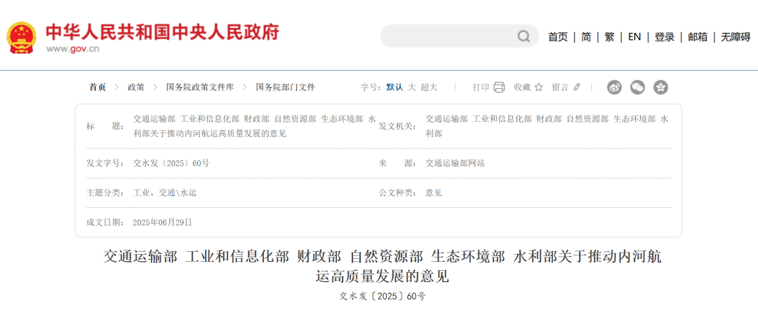 交通运输部工业和信息化部财政部自然资源部生态环境部水利部关于推动内河航运高质量发展的意见
