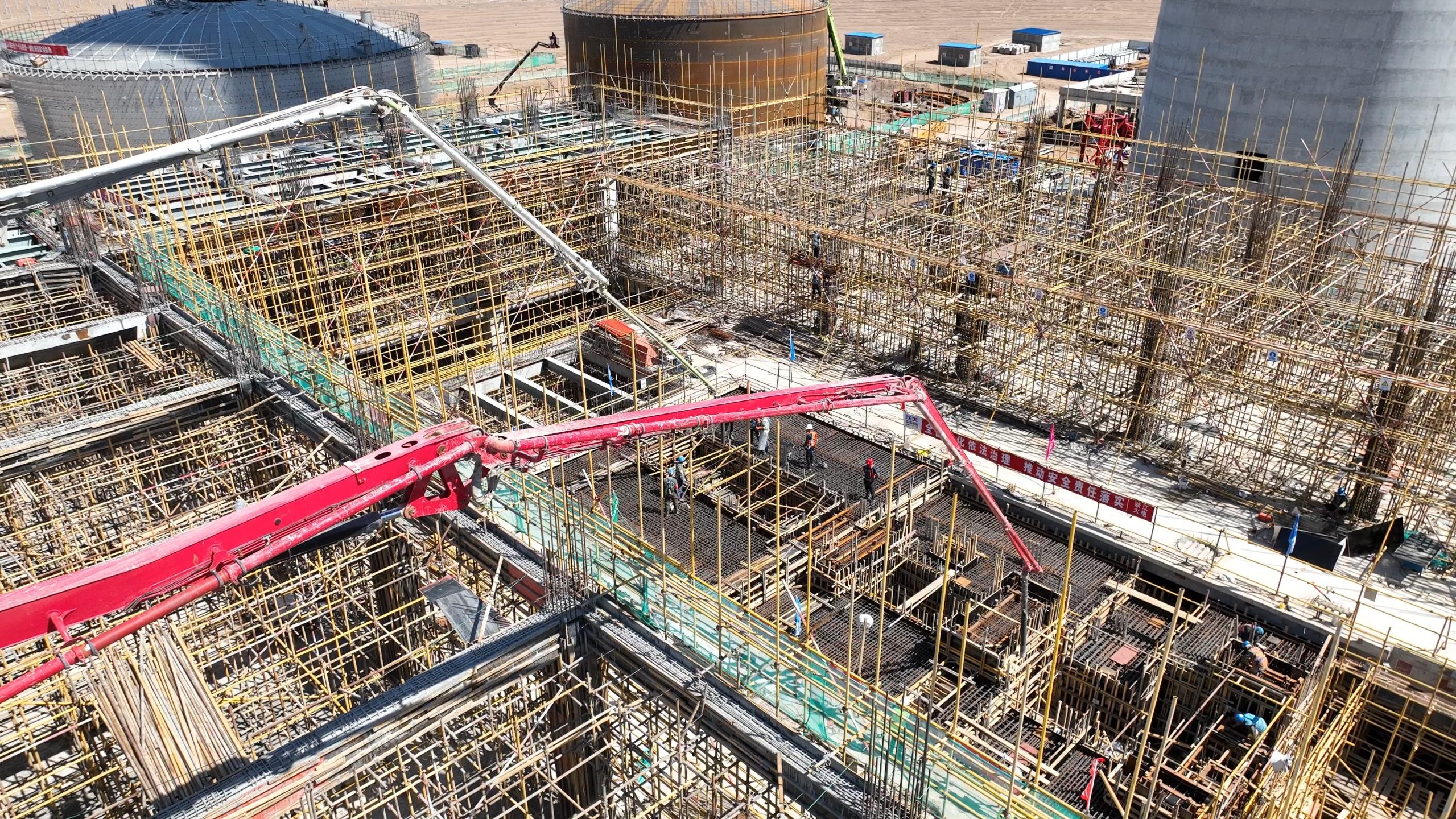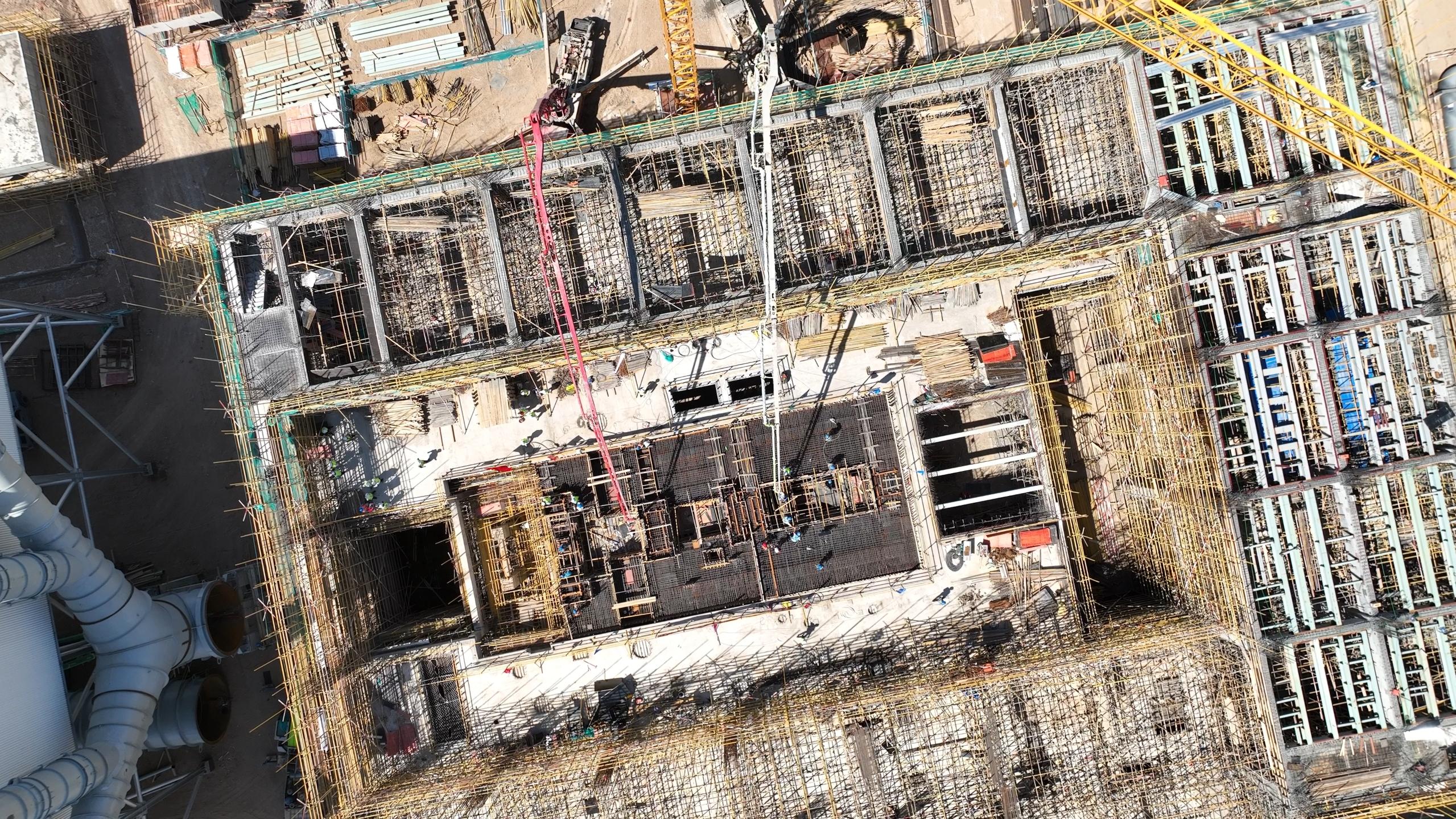 该项目由中国能源建设集团投资有限公司投资建设,于2024年5月开工,计划2027年6月完工。本次浇筑的汽轮机基础是光热电站核心结构,投运后需承载数千吨设备重量及高频振动荷载。本次浇筑混凝土方量600立方米,属于大体积混凝土浇筑,基础需嵌入大量预埋件、螺栓孔,施工精度直接影响设备安装定位。