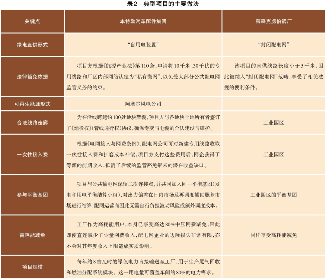 在全球加快推进碳中和的背景下,企业对稳定、低成本且可追溯的可再生能源需求日益迫切。“绿电直供”作为一项降低企业用电成本、释放经济与减碳红利的模式,正受到广泛关注。本文以德国的典型案例与法规演进为切入点,梳理绿电直供的法律逻辑与利益格局,并结合中国电力体制改革的实践,探讨可借鉴的政策路径与落地方案,旨在为中国绿色电力交易和产业低碳转型提供有益参考。欧洲绿电购买协议(PPA)主要包括三种形式:绿电直供、离现场购电(通过电网购买绿电)和套管购电(绿电代购)。其中,绿电直供协议是指可再生能源通过专用输电线路直接输送至用电客户。在此模式下,电网使用费用可能减少甚至被免除,相关设施的规模通常根据用户的用电需求定制,不足部分的电力则由电网运营商补充供应。绿电直供的法律基础是“封闭配电网”(私有微网)。此类配电网的供电范围通常限于特定的工业、商业或共享服务区域,除少量附属住宅外,不向居民供电。封闭配电网在法律地位上与普通配电系统相同,但在信息公开和费用收取方面享有多项监管豁免,因此为绿电直供线路提供了明确的法规支持。欧盟直到2009年才正式引入“封闭配电网”概念,而德国同类配电网早在百年前即已出现。因监管宽松,土地所有者常以此谋取垄断利润,使其盈利能力和投资回报率显著提升。例如,监管机构对电网使用费用等缺乏明确规定,使公用事业公司能够凭借自身的核心竞争力,在微网开发与运营中拓展盈利空间。此外,客户通常也倾向由一家服务商统一提供电、气、水和热等综合能源服务,协同效应显著,进一步增强了这一商业模式的吸引力。为与欧盟相关法令保持一致,德国还引入了“自用电装置”作为选项(见表1)。欧盟《电池和废电池法》首次将“绿电直供”写入法规,明确了用户点对点购电权利、绿电购买协议(PPA)的制度保障、接入灵活性和监管支持,构建了政策、技术与法律三位一体的直供支撑体系。总之,法律先行——“封闭配电网”与“自用电装置”及其监管豁免让绿电专线有法可循、无网费之忧,奠定直供商业模式的成本优势。2019年,在欧盟有关绿电直供的法令颁布后,德国开始推广绿电直供。如典型案例本特勒和蒂森克虏伯风电直供分别是“封闭配电网”和“自用电装置”的两个典型案例(见表2)。两个项目都凭借“长期锁价+低运维+电网使用费豁免”三重优势,企业可将购电成本锁定在可预测区间。其中,电网使用费减免是盈利模式的核心。该专用线路仅用4个月便完工。项目方与沿线近100位土地所有者快速达成用地协议,为工程顺利落地扫清障碍。项目能顺利并网且未与配电网运营商发生实质冲突,关键在于充分用足了德国现行法规与商业安排。更具创新性的是,在处理配电网拥塞导致的再调度问题时,蒂森克虏伯钢厂项目采用了一种灵活高效的本地绿电消纳机制:通过公共配电网,将局部过剩的风电电力传输至蒂森克虏伯附近的另一座钢厂,实现了区域内风电的就地利用与负荷匹配,既避免了上级电网的再调度成本,也提升了本地绿电利用率。总之,德国本特勒与蒂森克虏伯案例验证了直供专线在电力成本和碳成本上的“双赢”。不过,从当前实践看,德国的绿电直供模式面临“扩而不强”的现实瓶颈。可用于直供的项目资源有限,且项目布局受地理、配网条件和审批等多重因素制约。为释放潜力,德国政府正逐步放宽相关限制,并允许容量不超过1兆瓦的小型可再生能源装置通过市场溢价机制直接与工业用户签署供电协议,降低运营和接入门槛,鼓励更多分布式新能源电源参与直供体系。与德国类似,中国也有园区微电网和绿电直供的机制,但似乎推进并不顺利,可能主要有以下几方面原因,与德国模式的差异和增量配电网开发的共性问题都能找到对应(见表3、表4)。常州金坛电池产业园依托绿电直供模式,成功吸引宁德时代、蜂巢能源等龙头企业落户,带动200余家上下游企业加速集聚。园区通过公网专线实现绿电直供,不仅理清碳足迹,也为出口创汇提供支撑。而在德国,绿电直供的动因则不仅限于应对碳足迹管理,更在于通过减免电网使用费用获取可观的经济收益。根据德国能源购电方联合会2025年的数据,工业电价中约有37.3%属于电网使用费,凸显出电网成本的重要性。这也引出了一个值得关注的问题:备用容量成本如何分摊。一旦变压器等基础设施建成,长期闲置将造成资源浪费。常州金坛电池产业园通过容量补贴机制,缓解了因基础设施投入带来的电费上涨压力。本特勒则通过长期合同与现货市场相结合的购电方式,其电网使用费用采用容量与电量挂钩的定价机制,有效压缩了容量成本。值得强调的是,绿电直供的可持续运行离不开配电网售电公司所提供的平衡服务。正是这些平衡机制,在高比例可再生能源并网、用电波动性增强的背景下,保障了系统运行的稳定性与经济性。通过市场平衡机制与灵活响应,绿电直供企业得以免受容量冗余与价格波动的风险,实现真正意义上的多方共赢。从本质上看,无论是在德国还是中国,绿电直供的发展都必须面对一个共同的现实:在现有配电体系中争取“分一杯羹”,能否实现与配电网的利益共享,往往是项目成败的关键。与此相似,德国的“自用电装置”和“封闭配电网”也强调分布式就地消纳,但其制