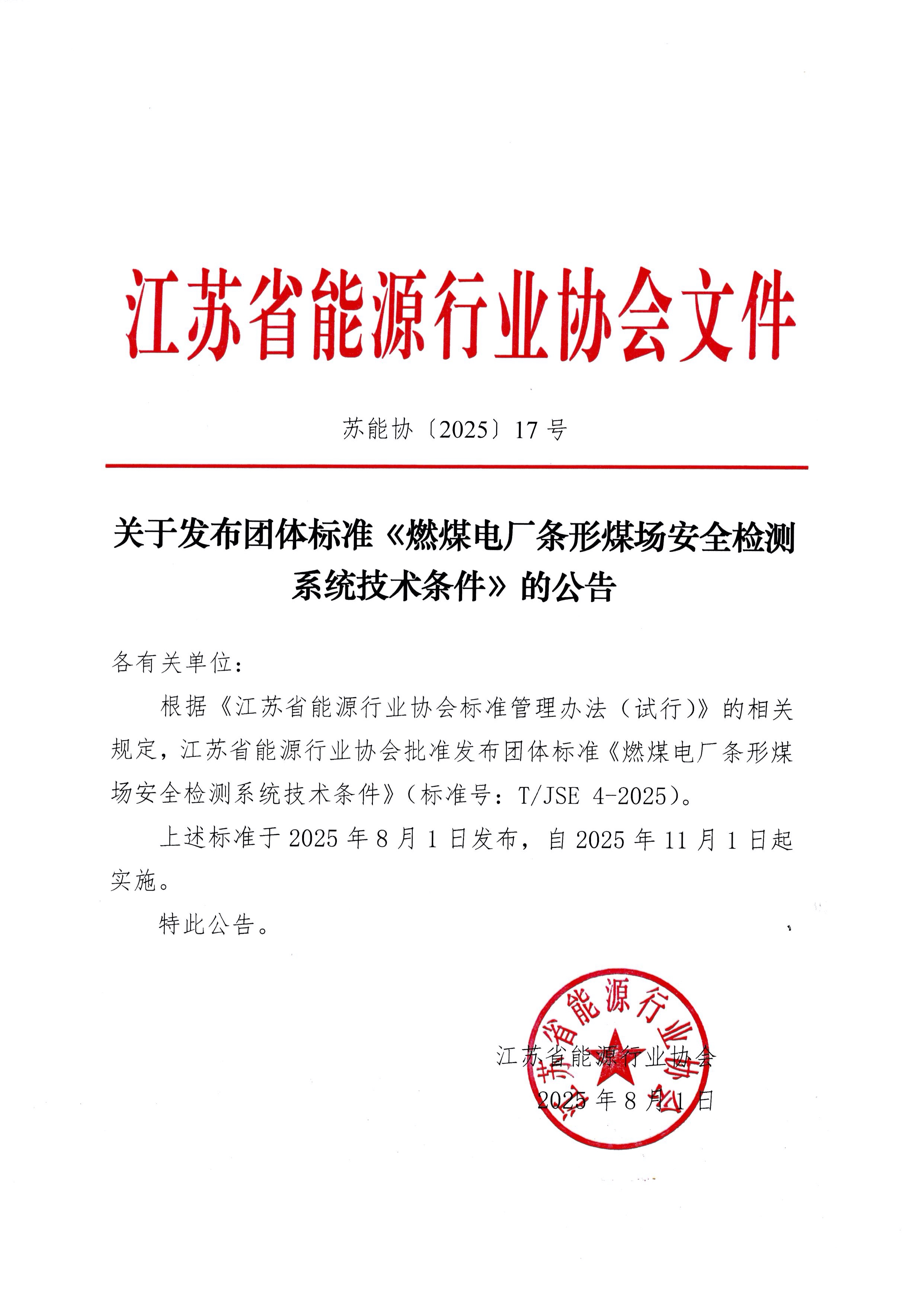 根据《江苏省能源行业协会标准管理办法(试行)》的相关规定,江苏省能源行业协会批准发布团体标准《燃煤电厂条形煤场安全检测系统技术条件》(标准号:T/JSE 4-2025)。
