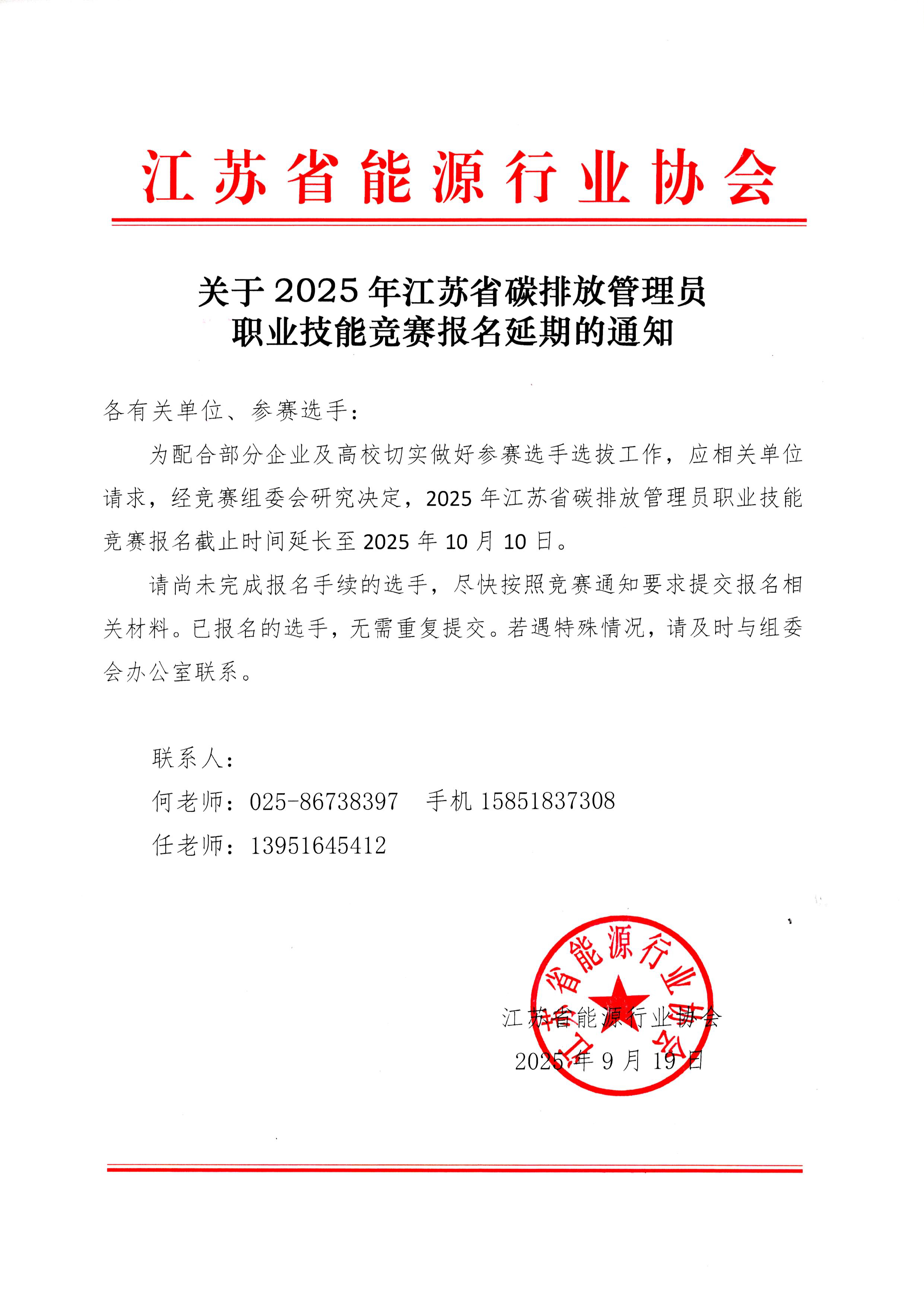 为配合部分企业及高校切实做好参赛选手选拔工作,应相关单位请求,经竞赛组委会研究决定,2025年江苏省碳排放管理员职业技能竞赛报名截止时间延长至2025年10月10日。