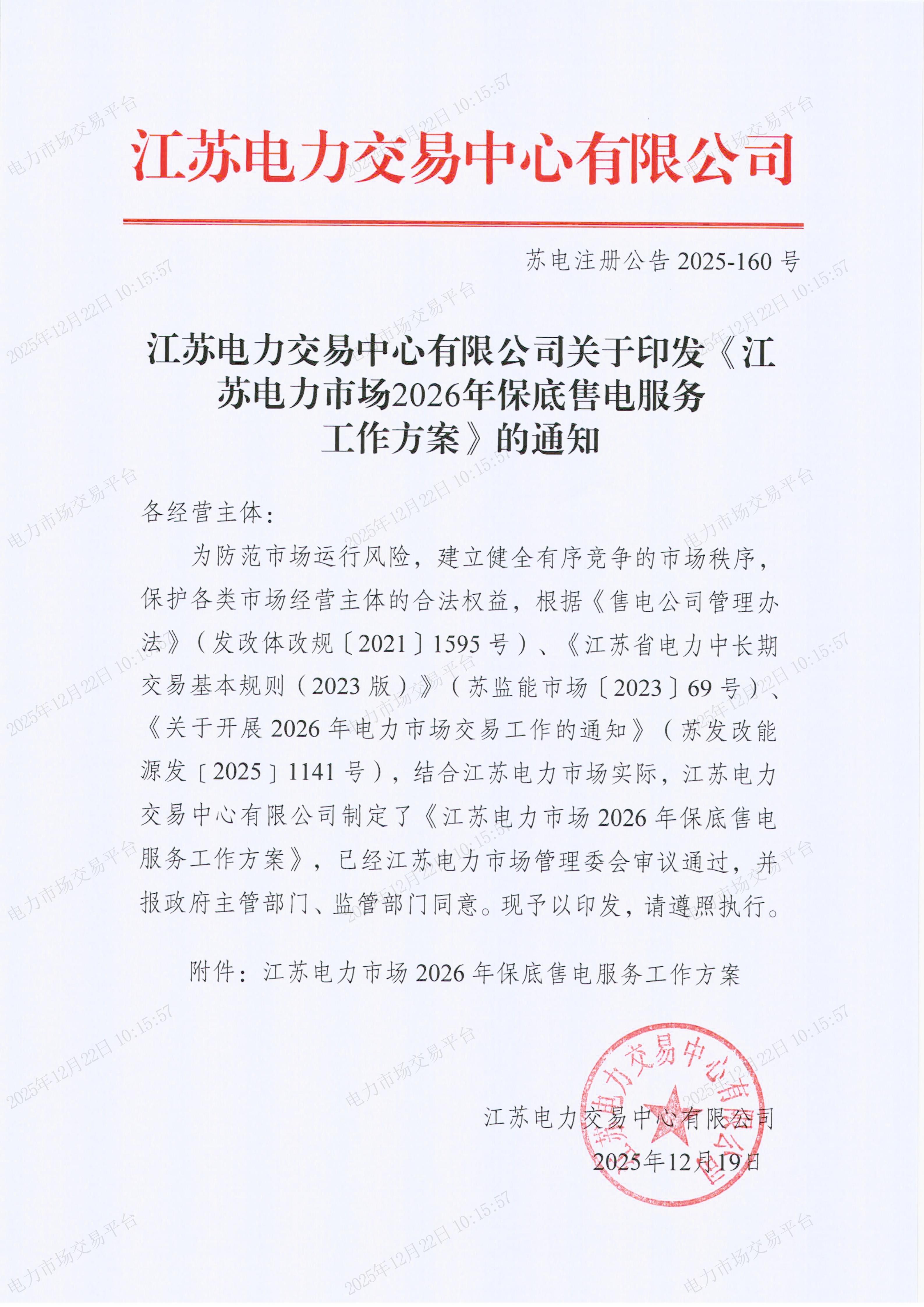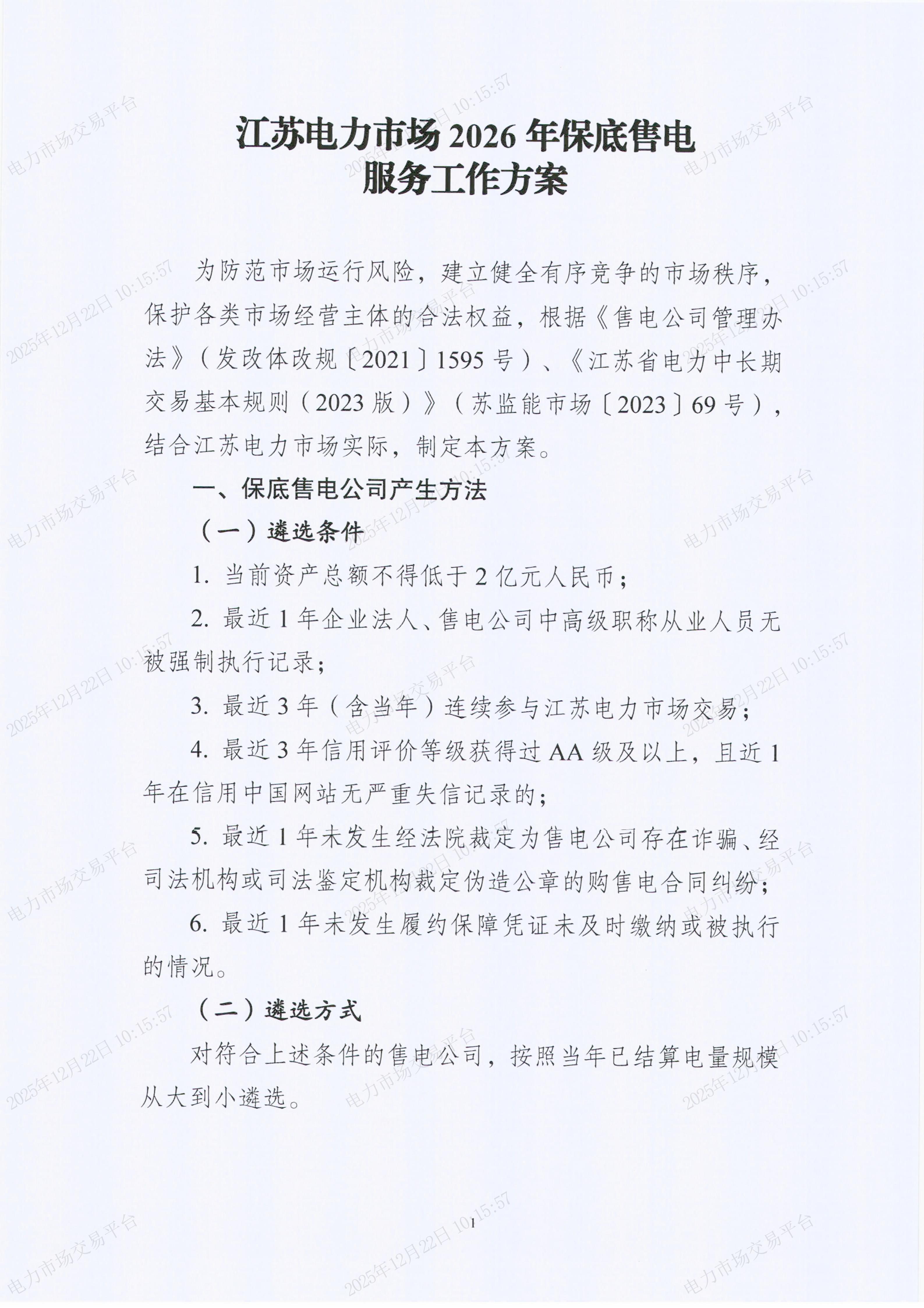北极星电力市场网获悉,12月19日,江苏电力交易中心发布《江苏电力市场2026年保底售电服务工作方案》。