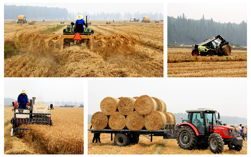 王甲云首先带领参会人员来到田间地头,在访仙镇的万顷良田里,小麦大部分已经收割完毕,只留下光秃秃的秸秆。地里没有一个挥汗如雨的农民,忙着干活的只有模样不同的几台机器。在这里,秸秆被直接打包成一个个巨型的圆筒,整整齐齐地码在车上。