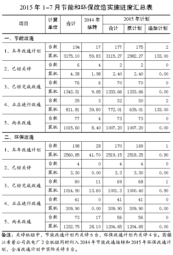 按照《关于加强煤电节能减排信息报送工作的通知》(苏发展能源发〔2015〕812号)要求,各市、重点发电企业及时上报了2015年煤电节能减排工作进展情况。经汇总,截至7月31日,全省共有76台1343.31万千瓦机组完成年度节能改造、80台1014.9万千瓦完成年度环保改造;共有35台811.81万千瓦机组正在开展年度节能改造、41台309.9万千瓦机组正在开展环保改造;共有77台1015.6万千瓦机组尚未实施年度节能改造、73台1232.75万千瓦机组尚未实施年度环保改造;另有8台6.875万千瓦已实施关停。